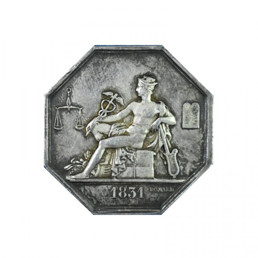 Εμφάνιση: Ο υδράργυρος καθισμένος κρατά το κηρύκειο με λέπια και ταμπλέτα νόμων στα πλάγια. Κάτω από το 1831, με υπογραφή DOMARD.